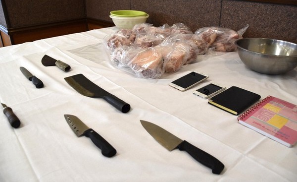 Những miếng thịt heo và dao làm bếp được tìm thấy trong căn hộ của bốn người đàn ông Việt Nam ở Ota, tỉnh Gunma, hôm 28-10. Ảnh: MAINICHI