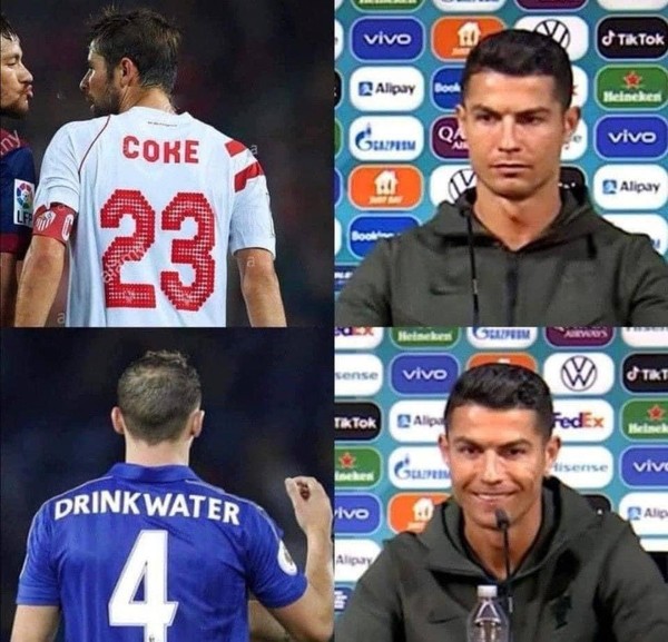 Ảnh chế hai sắc thái của Ronaldo trước trước việc chọn uống nước thay vì Coca.